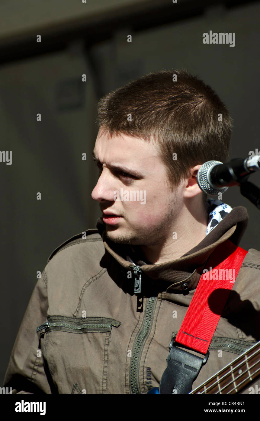 Download this stock image: Aaron Dennington, vocalist and guitarist with The Dark Jokes performing during the Rock & Roll Edinburgh half-marathon 2012.