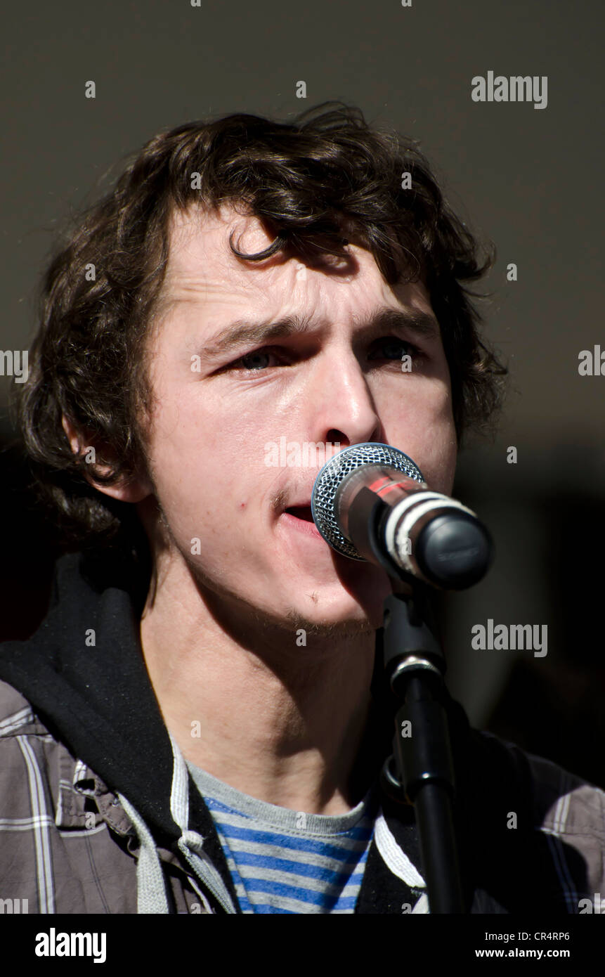 Aaron Dennington of The Dark Jokers. Aaron Dennington Lead Singer of The Dark Jokers, a new up and coming band, playing on the Mound , Edinburgh, ...
