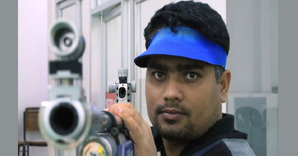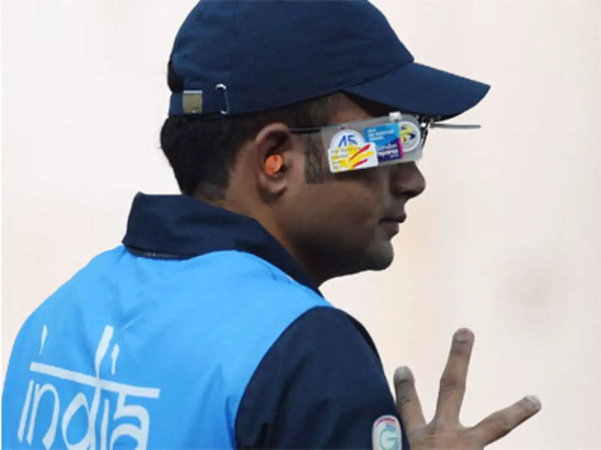 Bangladesh's silver medalist Abdullah Baki , India's gold medalist Abhinav Bindra and England's bronze medalist Daniel Rivers celebrate with their...