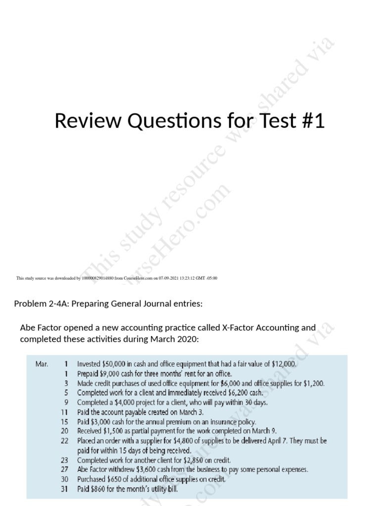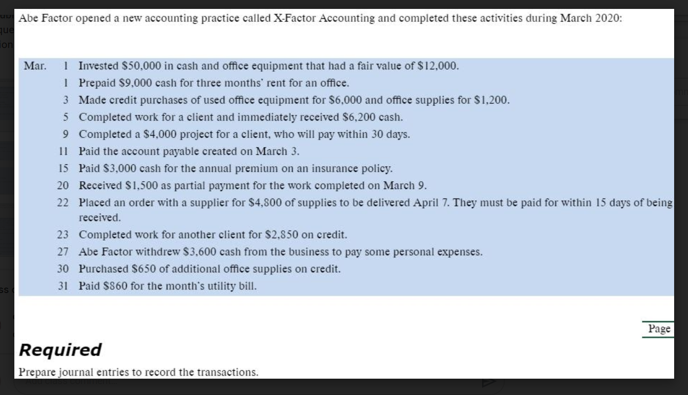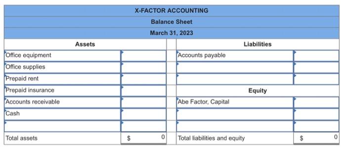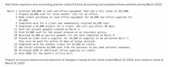 Abe Factor opened a new accounting practice called X-Factor Accounting and completed these activities during March 2023: March 1 Invested ...