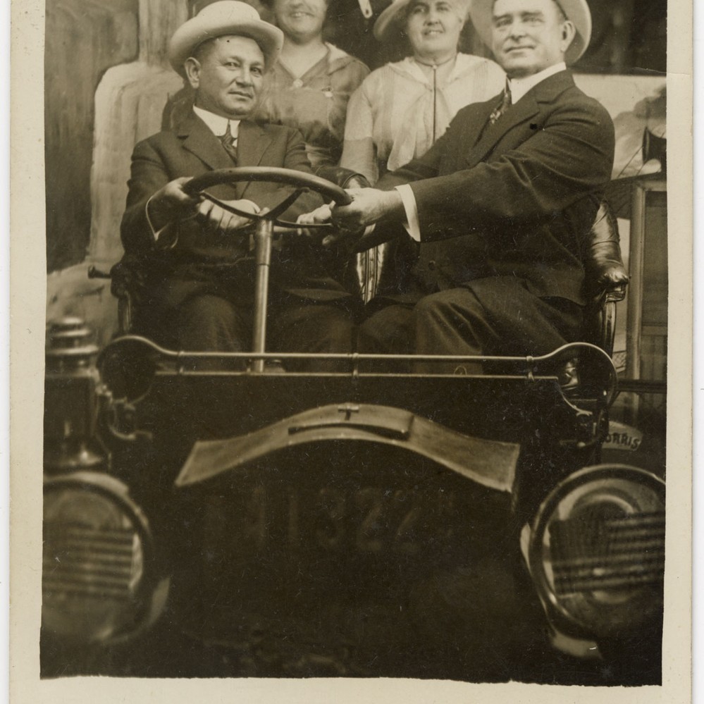 Abe Hobson is riding a black horse. Other people, horses, and an automobile are visible behind the two men. Type: image; Format: 11.7 x 9.2 cm. Sepia photograph