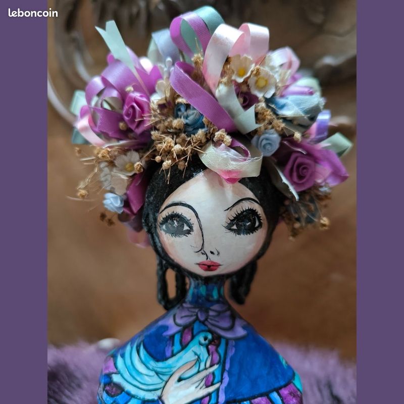 Collectible paper mache doll by Mexican Artist,Abelardo Ruiz. Doll is signed on bottom. A very pretty girl with flowers and ribbons I her hair. Holding a dove.