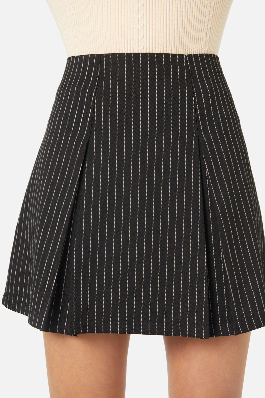 Pinstripe pleated skirt- retro & so cool, our abigail styles make for the perfect mix and match moments. cute box pleated style- mini length- high waisted.