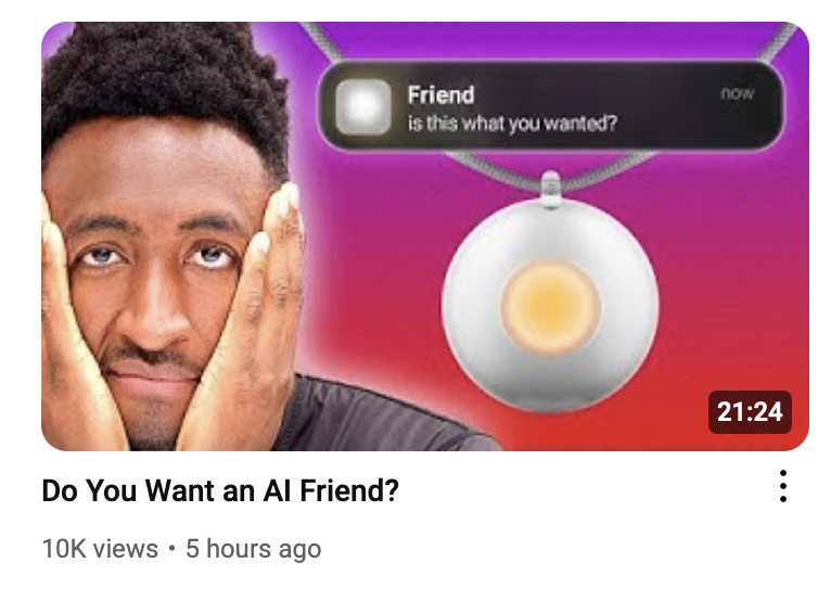What is it? Well, as the Friend website states, it's a "wearable Al friend designed to be a close confidant for everyday life." And who among us ...