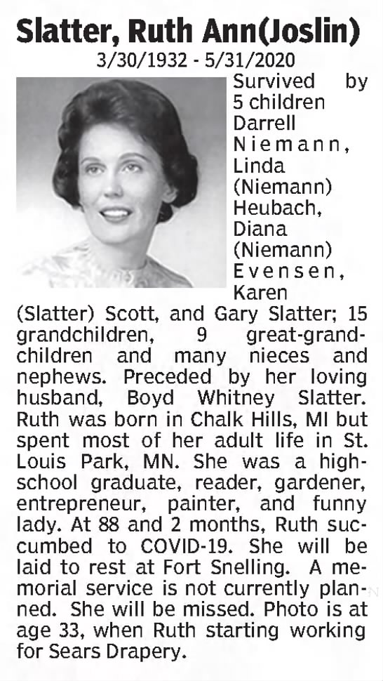 Mary Ann Joslin Obituary. JOSLIN, Mary Ann (nee Altemeier) – Mary Ann was the beloved wife of 63 years to the late Donovan Thomas ...