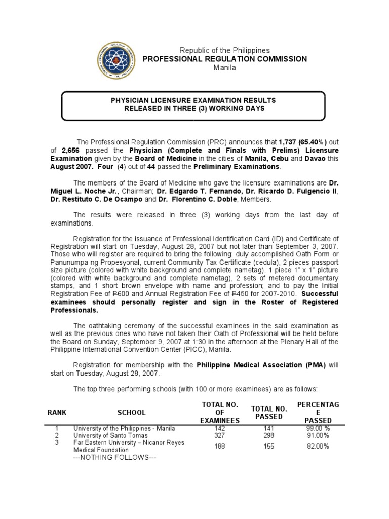 Search address historyPhysician Licensure Examination Results released in three (3) working days