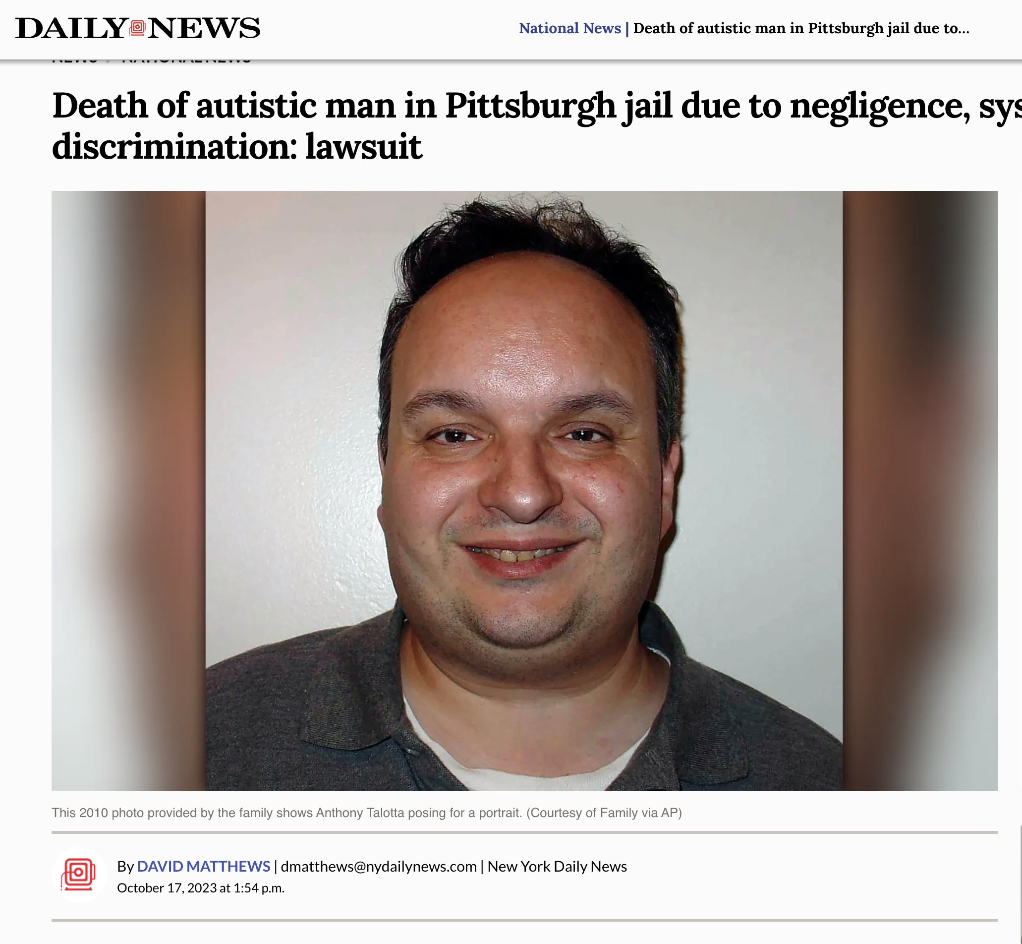 ... Anthony Talotta in September 2023 while he was incarcerated at Allegheny County Jail. In a tragic case of deliberate indifference, systemic ...