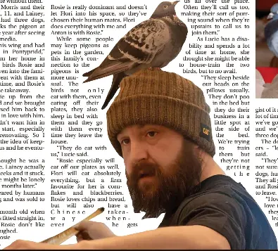 A family has two pigeons as pets who eat and sleep with them