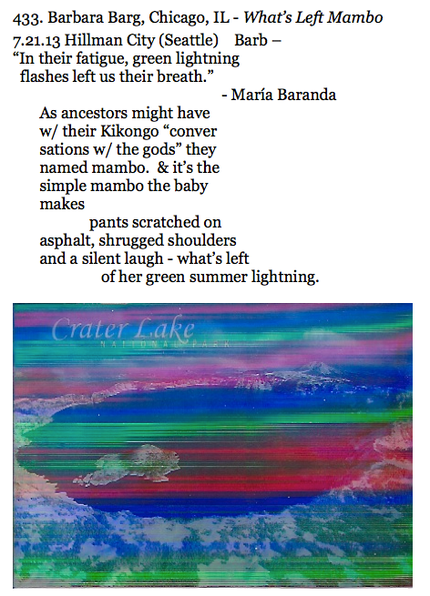 Barbara Barg, Chicago, IL – What's Left Mambo (3d scan of Crater Lake postcard not quite like having the card in your hands). Audio Player.