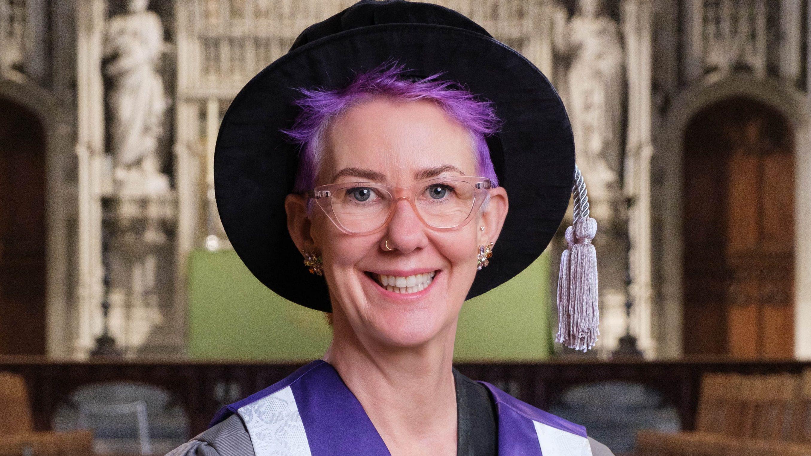 Nurse honoured for working in dangerous places · Rebecca Platt is smiling at St Albans Abbey. · Nurse Becky Platt, with pink hair, is smiling as ...