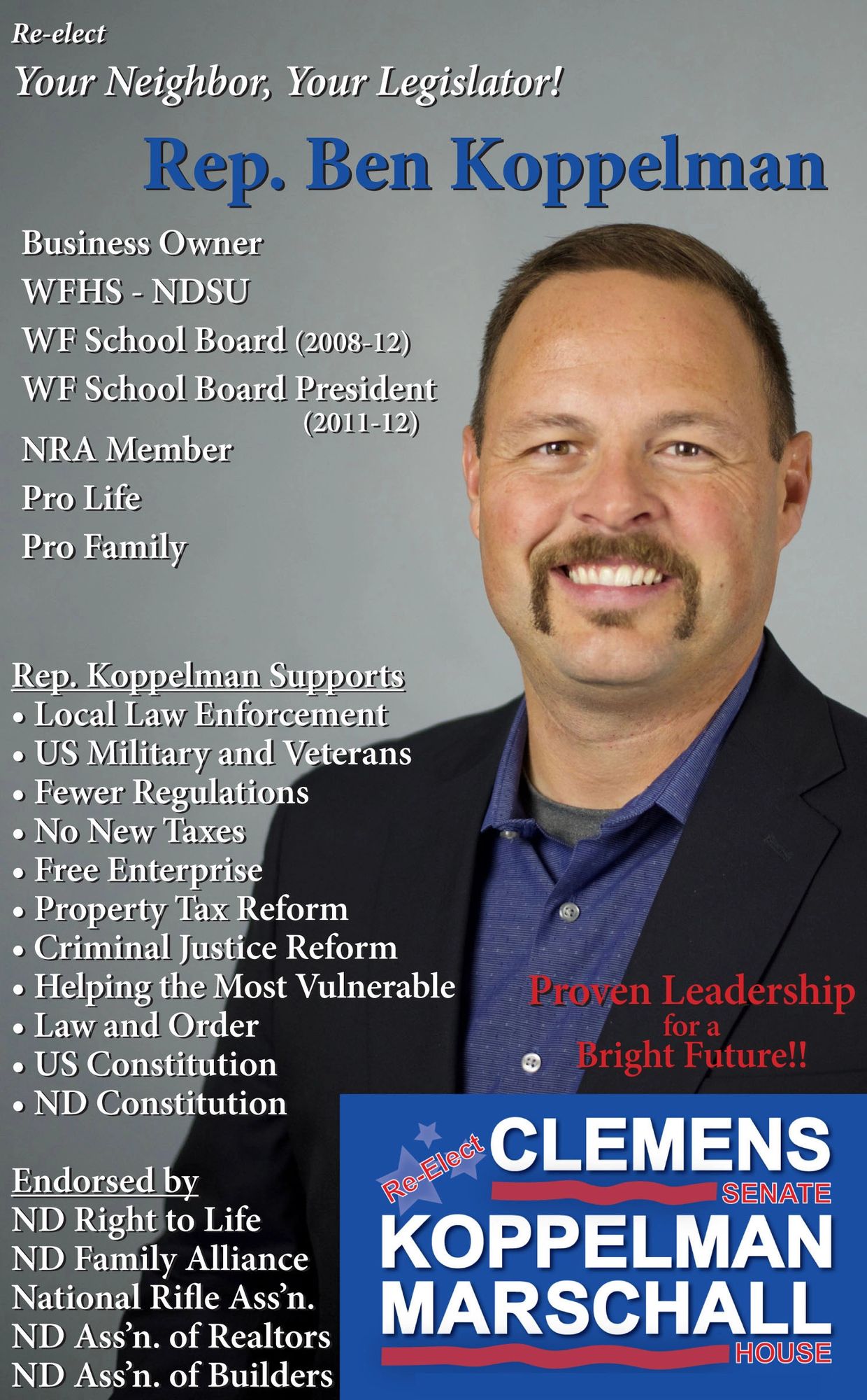 Ben Koppelman · Commercial Construction · Attended NDSU · West Fargo School Board (2008-2012); School Board President (2011-2012) · Married (Julie); 2 children; 1 ...