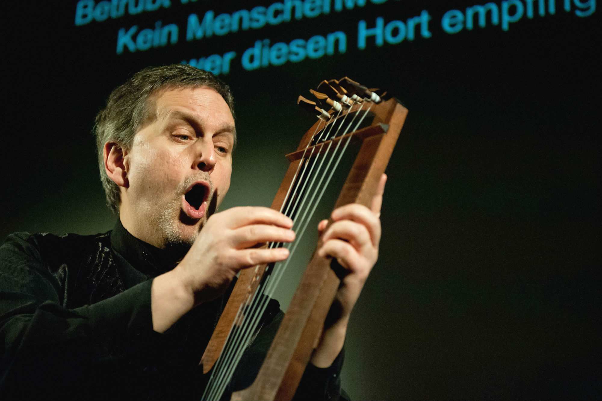 Medieval harpist Benjamin Bagby, a middle aged white man wearing a black shirt and pants. Benjamin Bagby performs "Beowulf" onstage. Photo ...