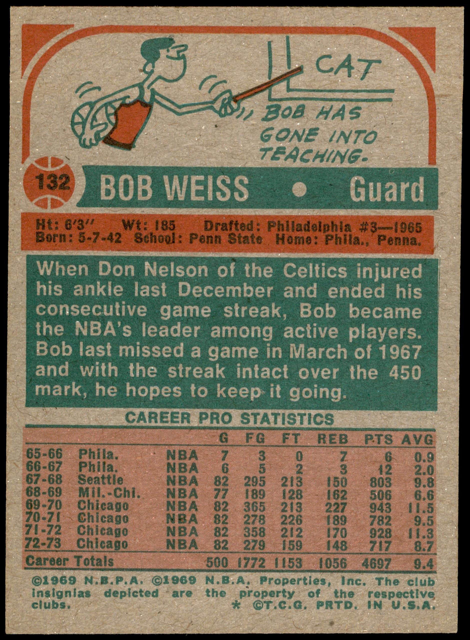 Bob Weiss. Position: Guard. 6-2 (188cm). School: Penn State (Men). Draft: Philadelphia 76ers, 3rd round (5th pick, 25th overall), 1965 NBA draft.
