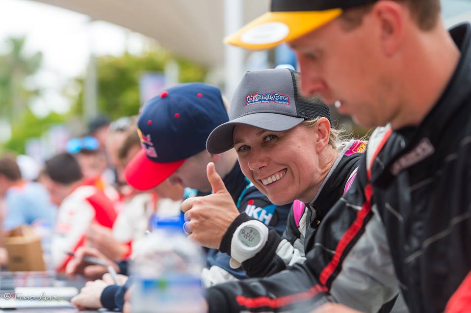 Brendan Reeves and Rhiannon Smyth flying the Aussie flag at WRC Rally Australia in Coffs Harbour