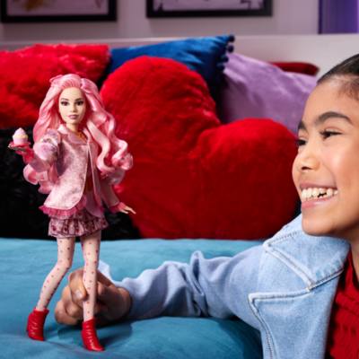 This fashion doll from Bridget, young Queen of Hearts, looks like her character from the movie with her wavy pink hair and iconic clothing and accessories fans ...