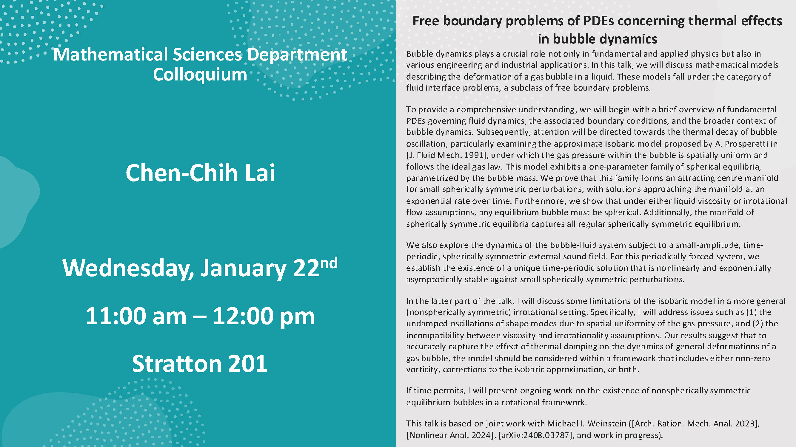 Mathematical Sciences Department Colloquium. Speaker: Chen-Chih Lai. Wednesday, January 22, 2025. 11:00 am - 12:00 pm. Stratton 201.