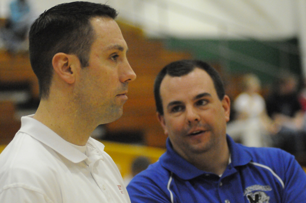 CHRIS DEPEW, LEFT, then the assistant men's basketball coach at SCCC, comforts a player after the loss in last March's national championship game at Delhi.