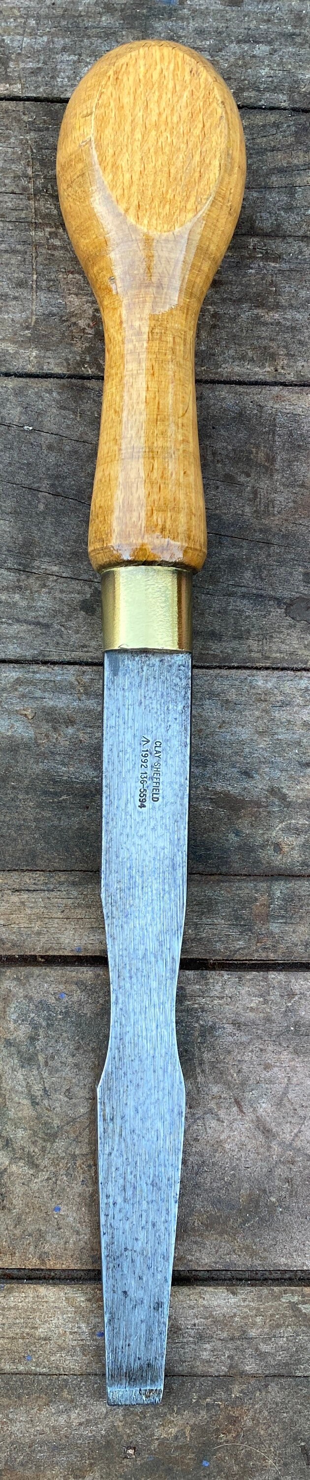 Vintage 8 3/4 x 3/4 Clay Cold Chisel. Full length is approx. 8 3/4, the blade is approx. 3/4 wide at the tip. The handle is marked Clay Sheffield.
