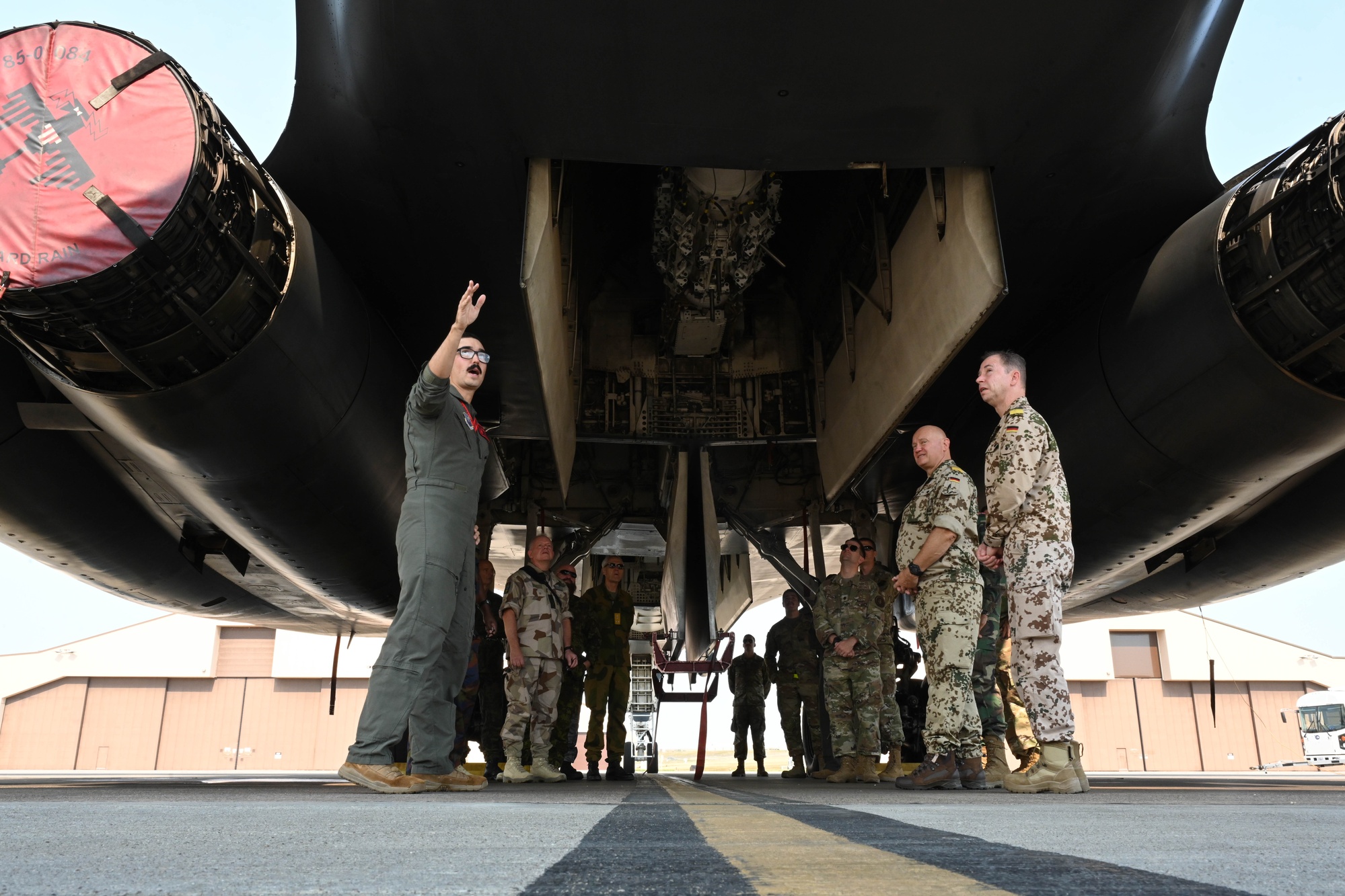 U.S. Air Force Capt. Colin Blount, 34th Bomb Squadron B-1 weapons systems operator, left, showcases a B-1B Lancer to a group of foreign defense attachés at ...