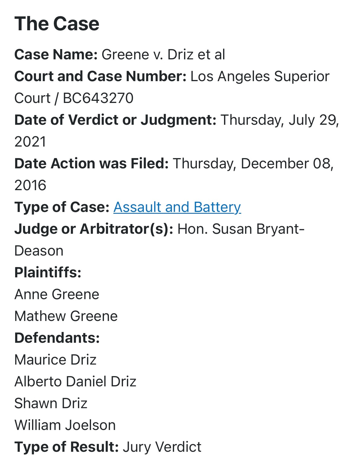 On 12/08/2016 ANNE GREENE filed a Personal Injury - Other Personal Injury court case against ALBERTO DANIEL DRIZ in Los Angeles County Superior
