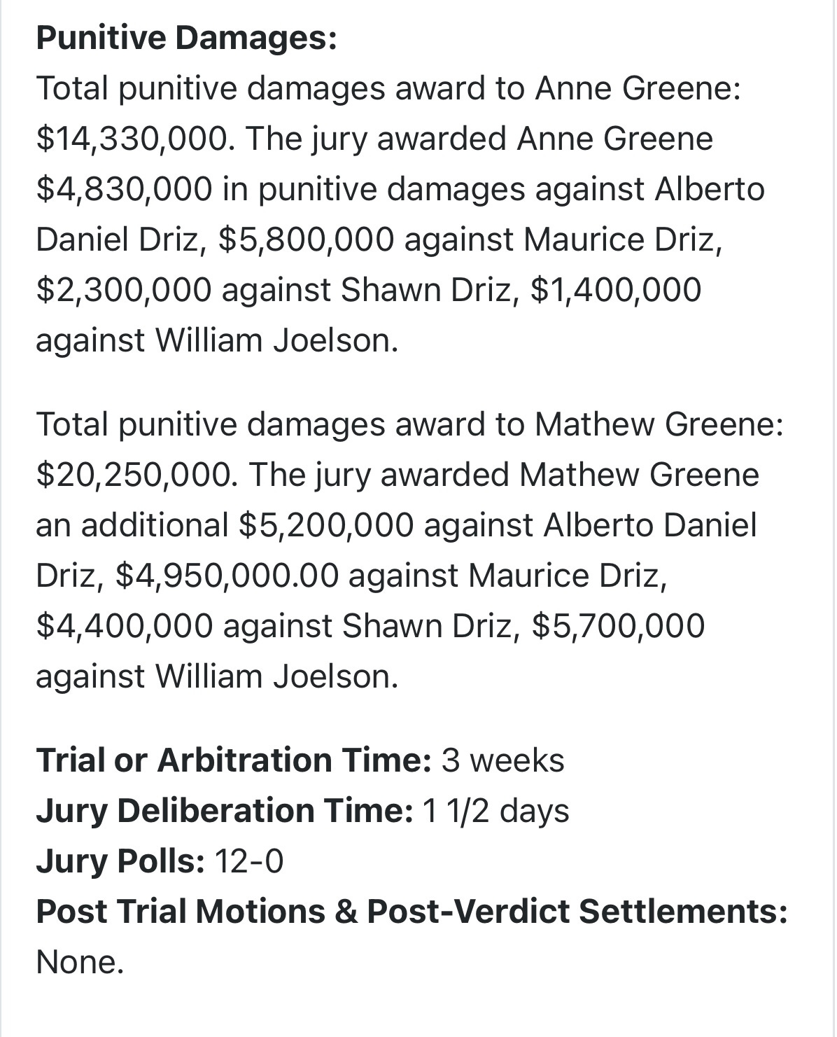 The jury awarded Anne Greene $4,830,000 in punitive damages against Alberto Daniel Driz, $5,800,000 against Maurice Driz, $2,300,000 against Shawn Driz, ...
