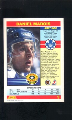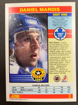 Daniel Marois. Right Wing -- shoots R Born Oct 3 1968 -- Montreal, PQ [57 yrs. ago] Height 6.01 -- Weight 190 [185 cm/86 kg]. Drafted by Toronto Maple Leafs.