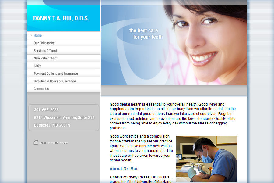 Danny T.A. Bui, D.D.S. :: Family & Cosmetic Dentistry in Bethesda, MD. Home. Our Philosophy. Services Offered. New Patient Form. FAQ's. Payment Options and ...