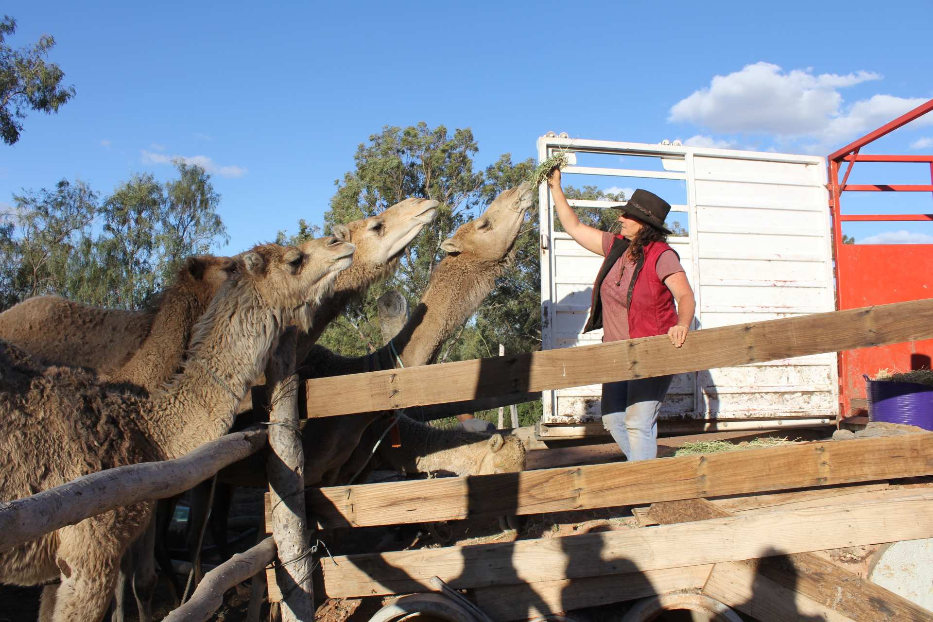 A woman coaxes three camels on to a truck with a hand full of hay. Darlene Leeson helped to coax camels from the sanctuary onto a truck for ...