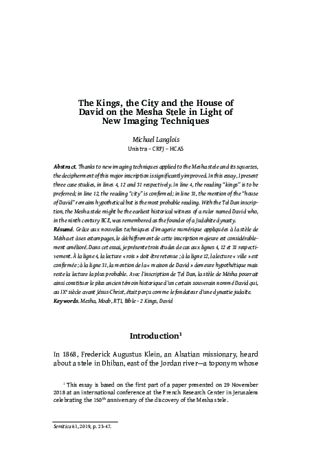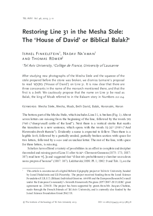 (PDF) Restoring Line 31 in the Mesha Stele: The 'House of David' or ...