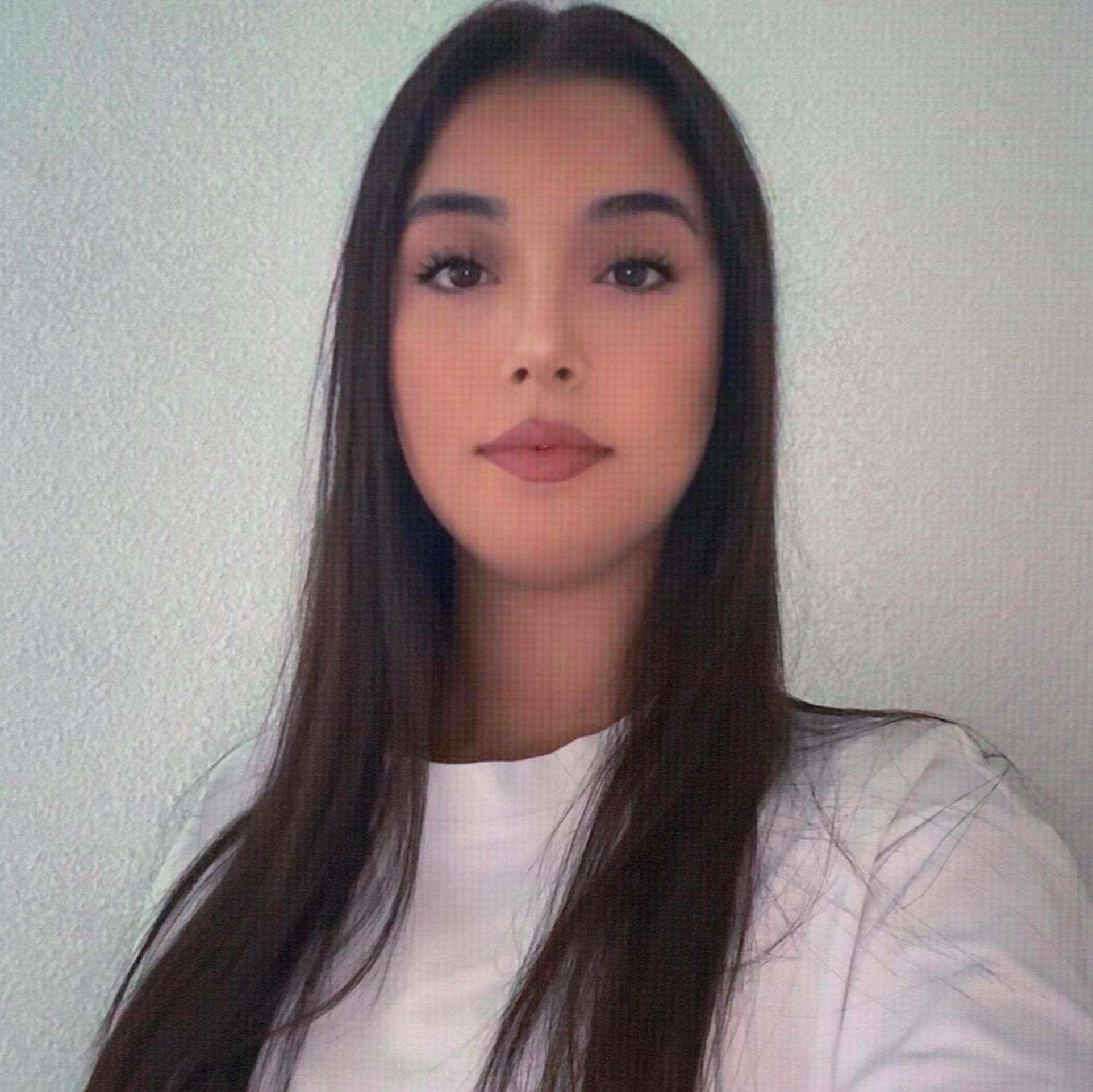 14 with a sinister smile and and too much makeup.