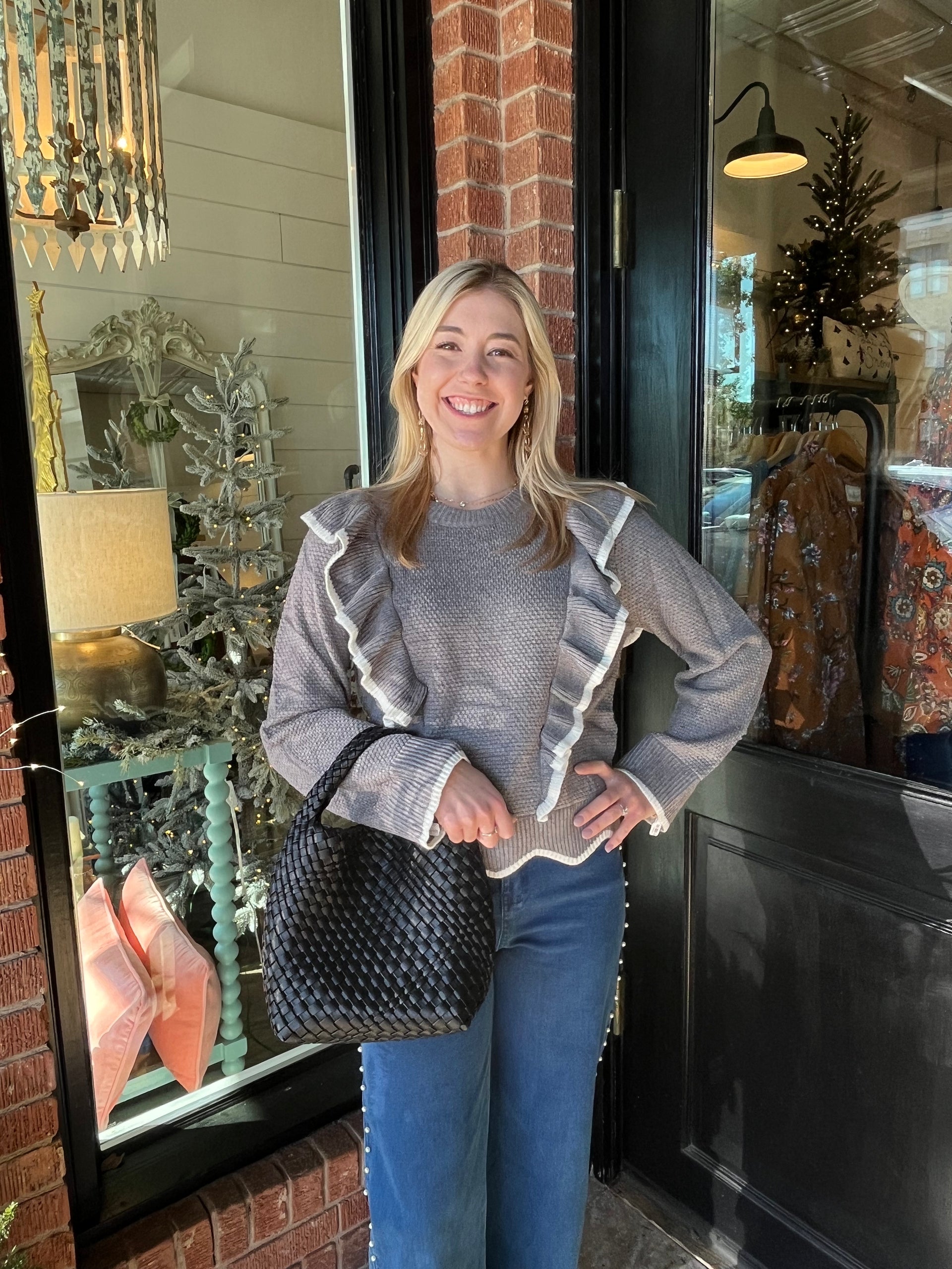 Stay cozy and stylish with our DeDe Grey Sweater! This fun sweater features long sleeves and a playful ruffle front. Perfect for any occasion, ...