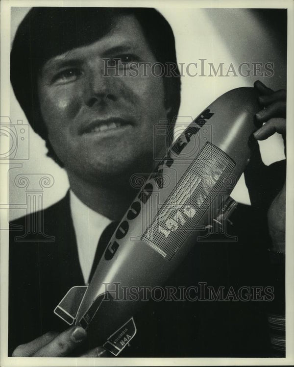 1976 Press Photo Goodyear blimp pilot Don MCDuff holds new toy ...