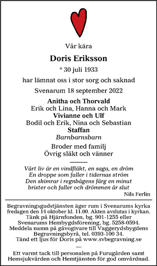 Doris Eriksson | Dödsannonser | Minnessidor | Annonsportal