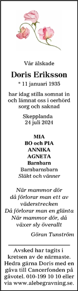 Doris Eriksson. * 11 januari 1935 har idag stilla somnat in och lämnat oss i oerhörd sorg och saknad. Skepplanda. 24 juli 2024. MIA. BO och PIA.