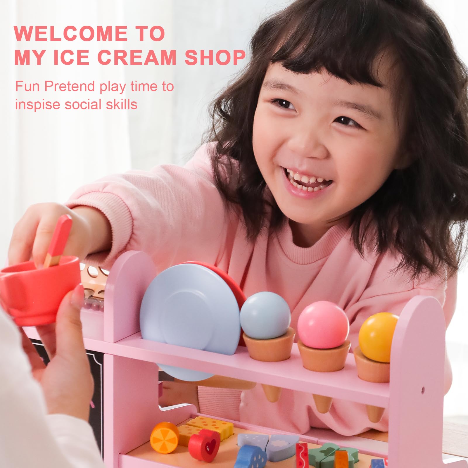 Scoop & Serve Ice Cream Counter: Wooden Play Food Set. Scoop up some cool treats with this all-inclusive, 20-piece pretend play ice cream counter! The sturdy wooden tabletop counter …