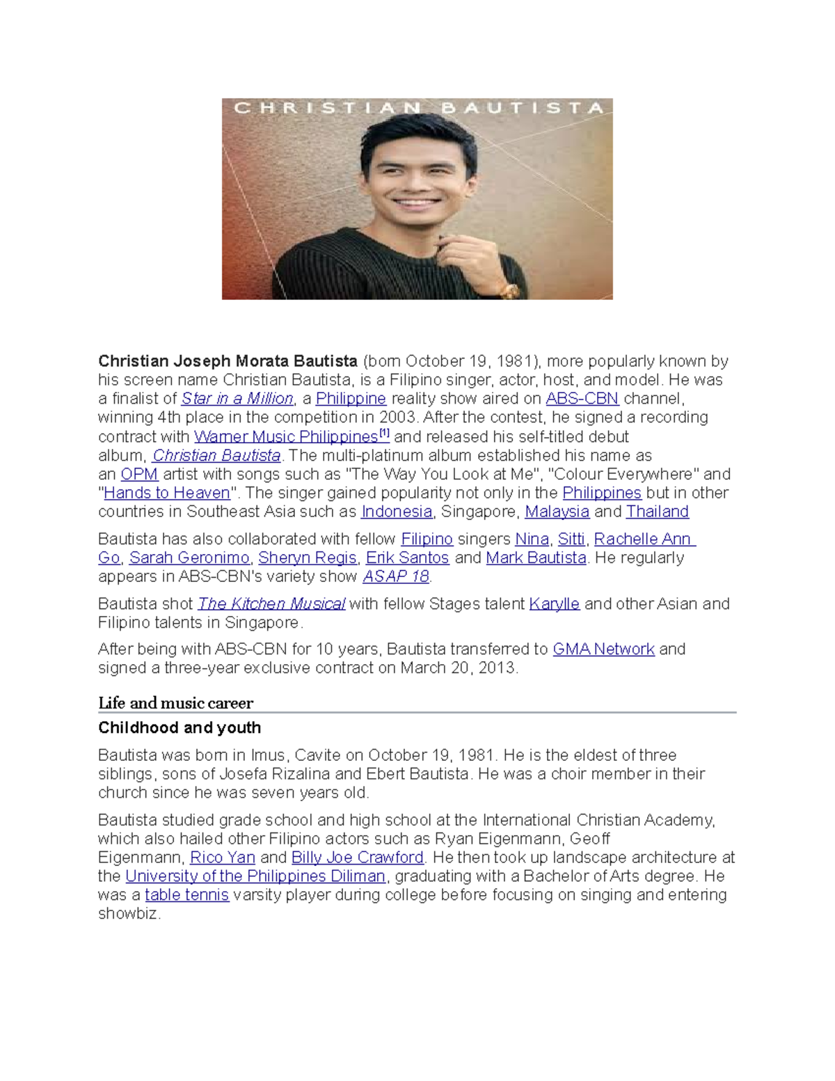 Bautista was born in Imus, Cavite on October 19, 1981. He is the eldest of three siblings, sons of Josefa Rizalina and Ebert Bautista. He was a choir member in ...