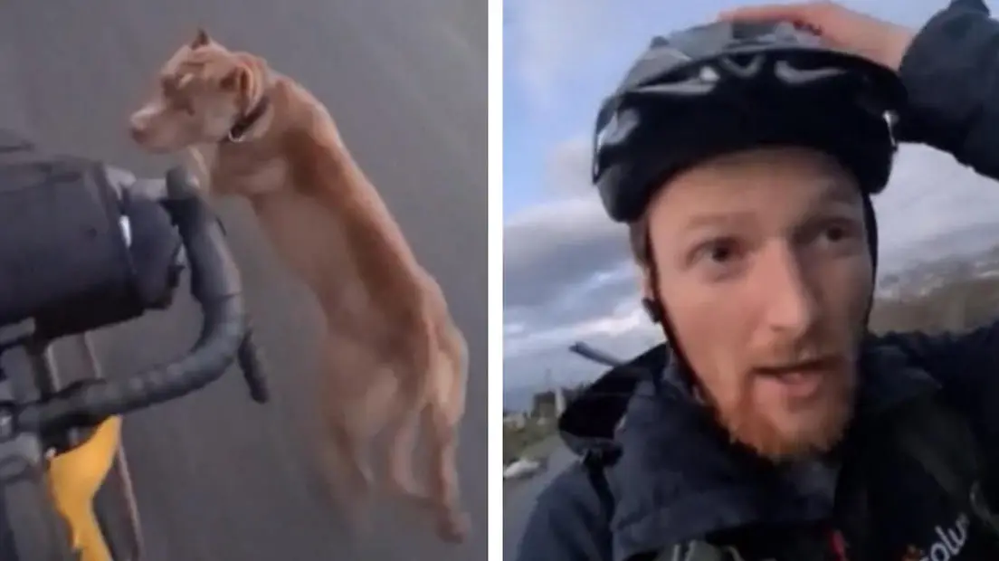 Two giant pitbulls chase cyclist at speed, keeping up with his bike