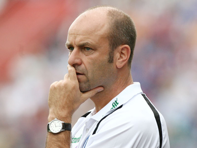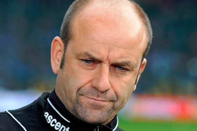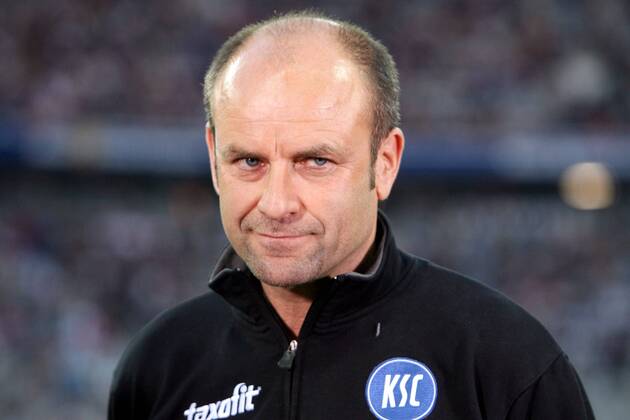 Edmund Becker, head coach of Karlsruhe, looks on during the Second Bundesliga match between Hansa Rostock and Karlsruher SC at the Ostsee stadium on...