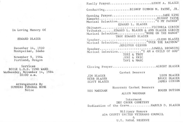 Born in Montpelier, Idaho on 14 Dec 1909 to Alfred Blauser and Emma Trussel. Edward Blaser married Bernice Valeria Day. He passed away on 9 November 1984 in ...
