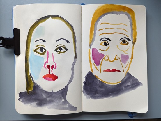 I'm trying to get back into watercolor. I struggle with it; but I like these ones I did. Photo of a double page spread from a sketchbook, with two faces ...