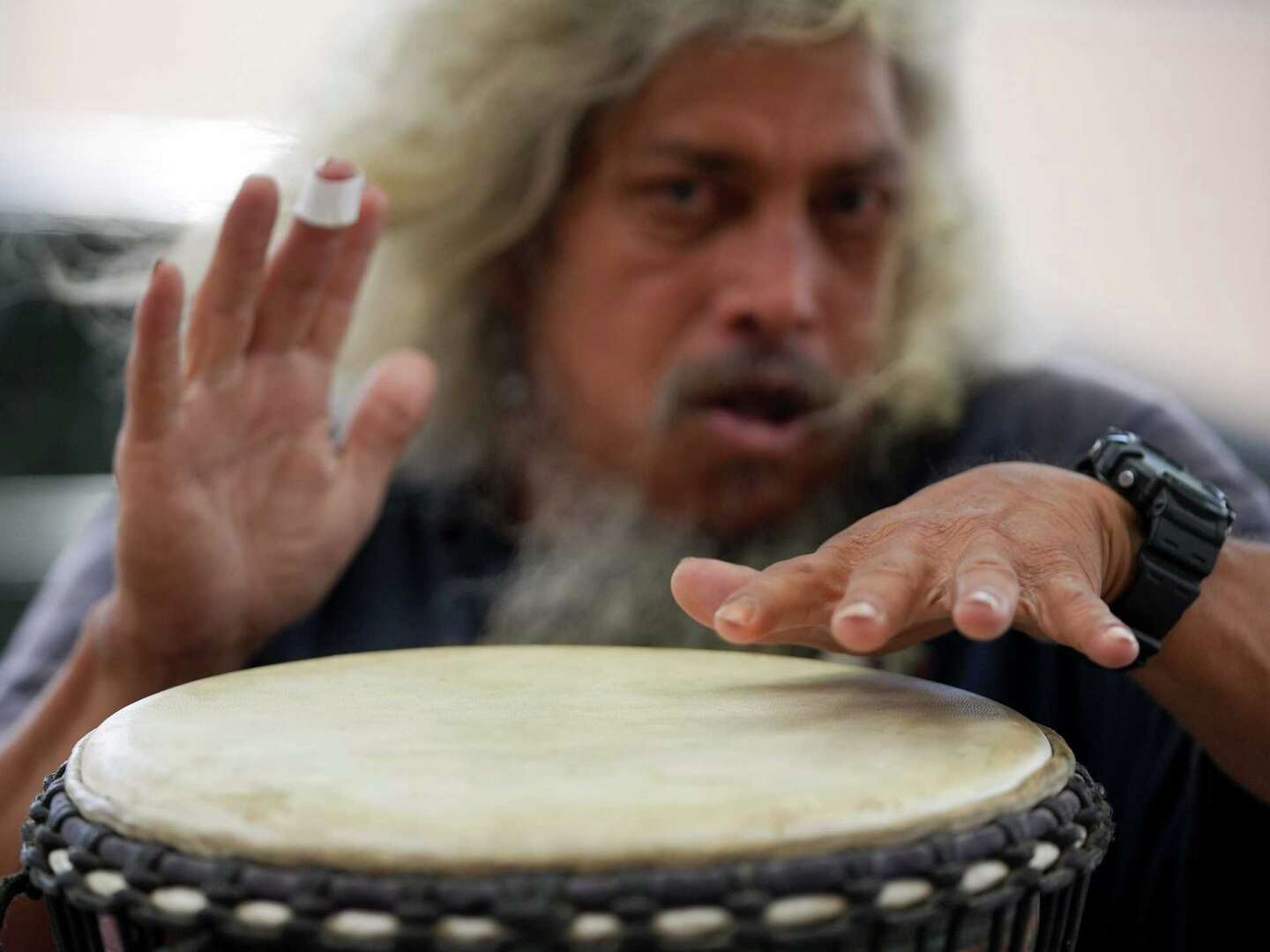 Homeless musician, known as Bongo Man, plays the goatskin drum in Austin's West Campus