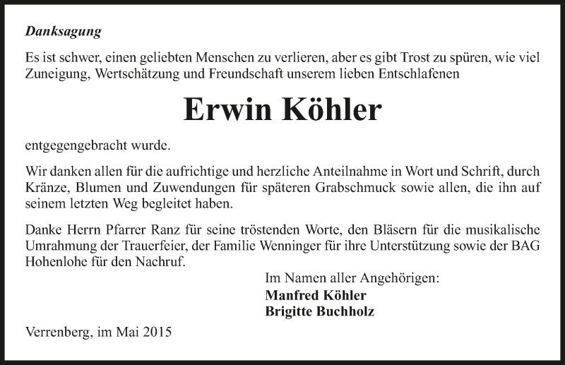Search all Erwin Kohler Obituaries and Death Notices to find upcoming funeral home services, leave condolences for the family, and research genealogy.