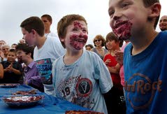 Ethan Shaughnessy, center, and Ryan Barts, right, both of Hammonton smile after participating in last year's blueberry pie eating contest at ...