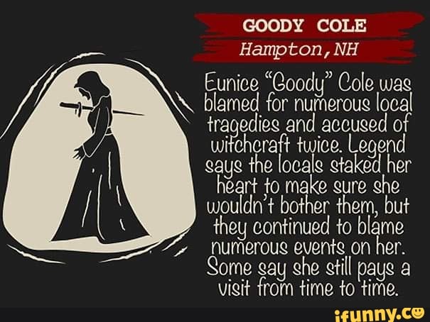 Eunice Cole, aka “Goody” was the only woman convicted of witchcraft in the state of New Hampshire. She was born in England in 1590 and worked as an indentured ...