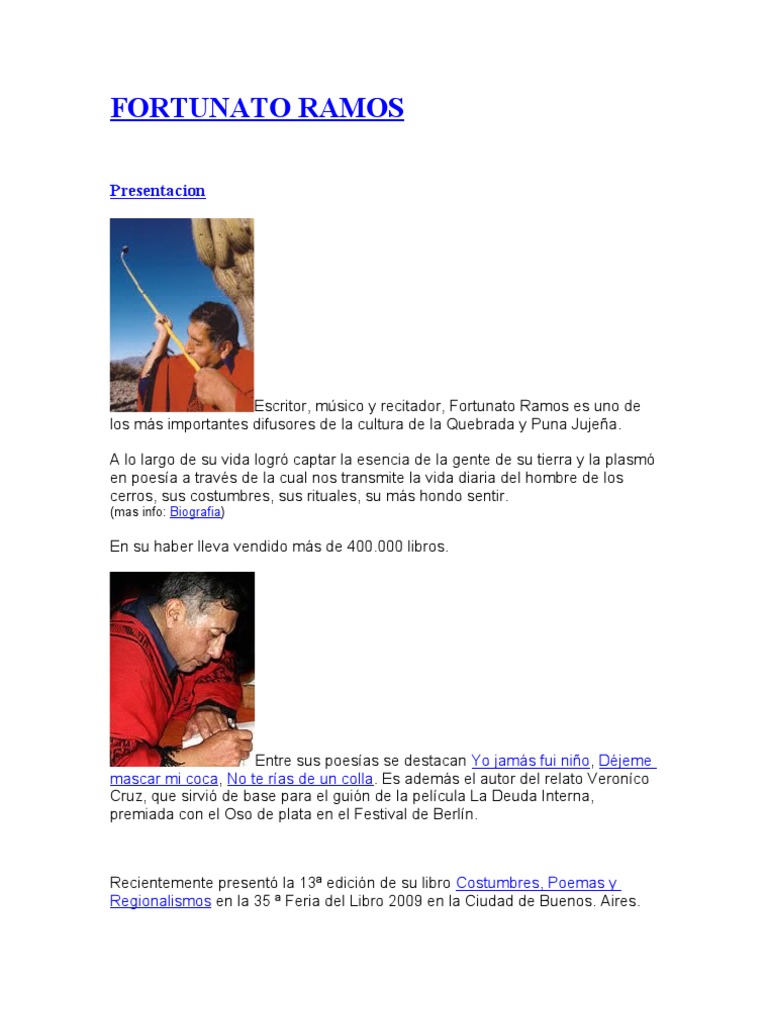 Fortunato Ramos (16 de octubre de 1947 en Coraya, Departamento de Humahuaca, Provincia de Jujuy) es un músico, poeta, recitador, escritor, maestro rural y ...