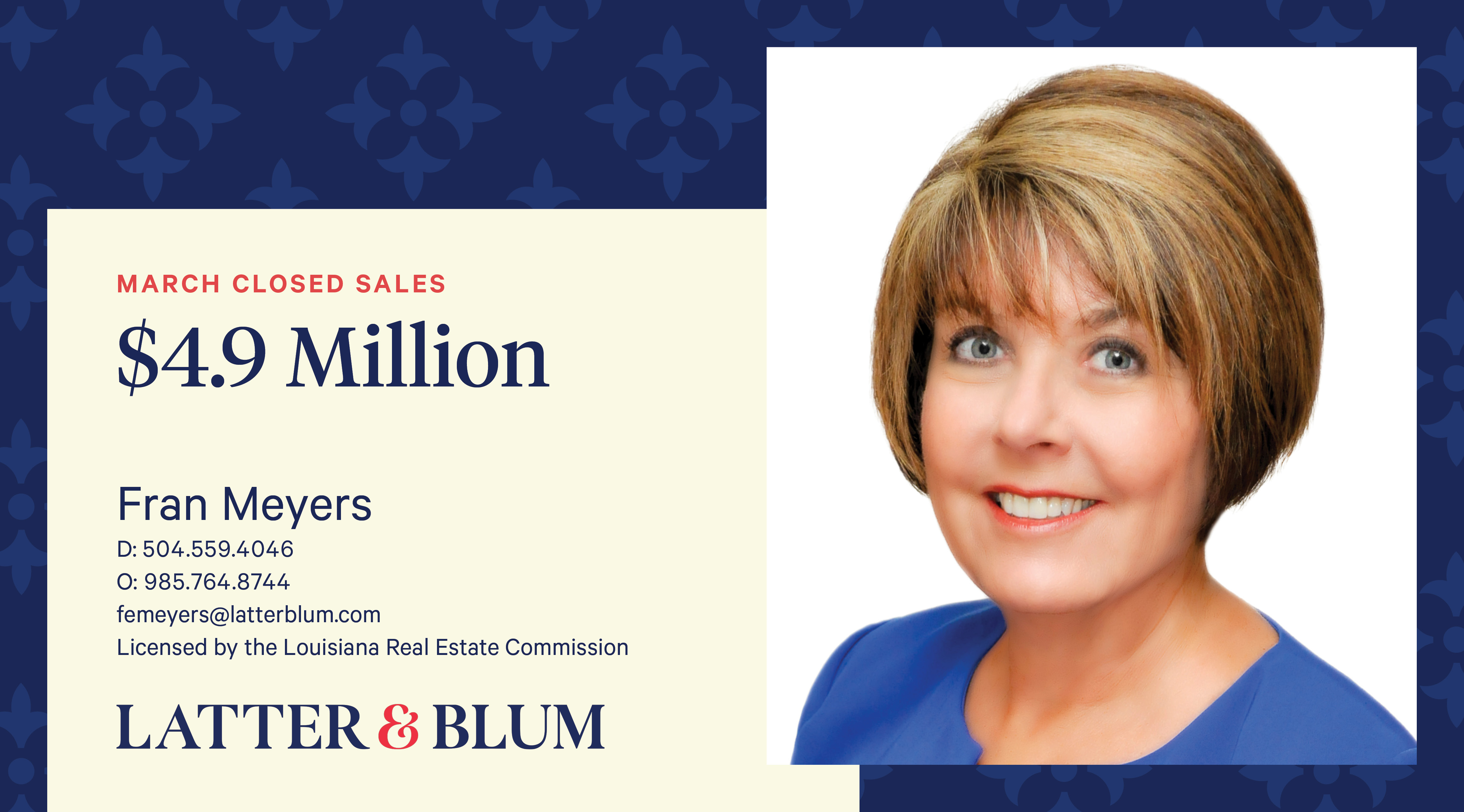 Meet Fran Meyers. ABR, CSP, CRS, GRI, SRS. Destrehan Office; (504) 559-4046; femeyers@latterblum.com · VIEW WEBSITE. Destrehan Office. cell: (504) 559-4046.