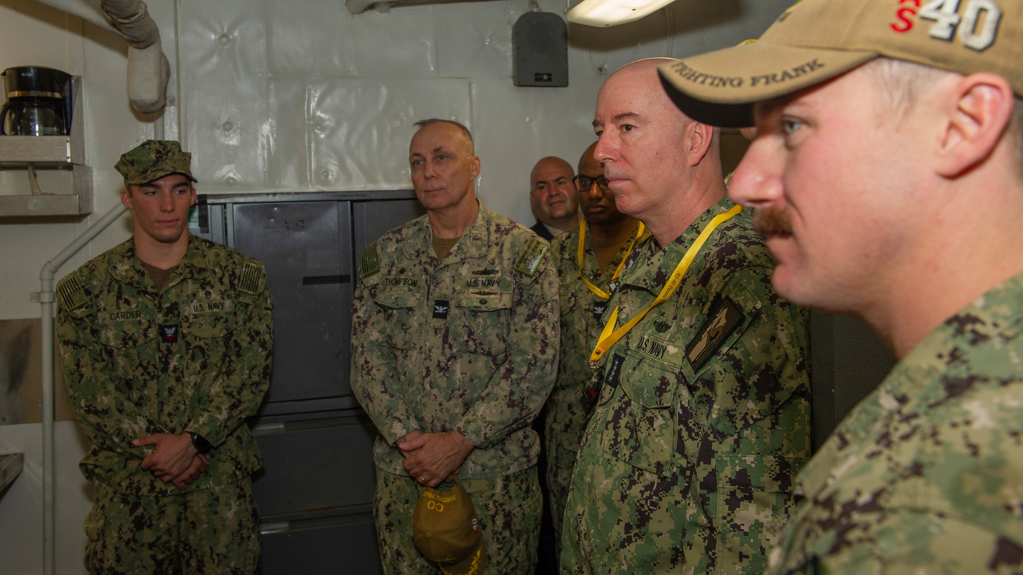 Leadership aboard the submarine tender USS Frank Cable (AS 40) discuss the Frank Cable namesake for National Submarine Day, Apr. 8.