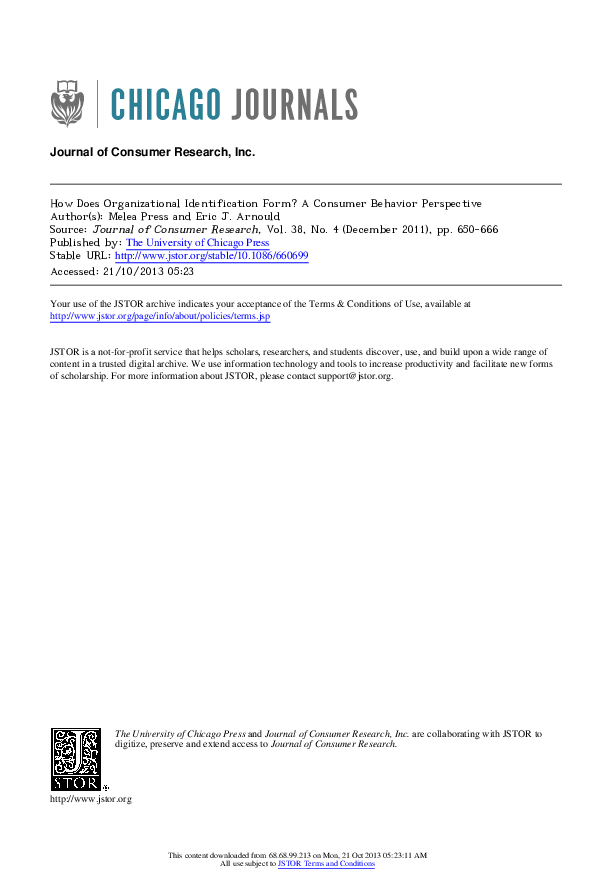 The concept of organizational identification originated with Blake Ashford and Fred Mael. In applying social identity theory—which holds that one's self ...