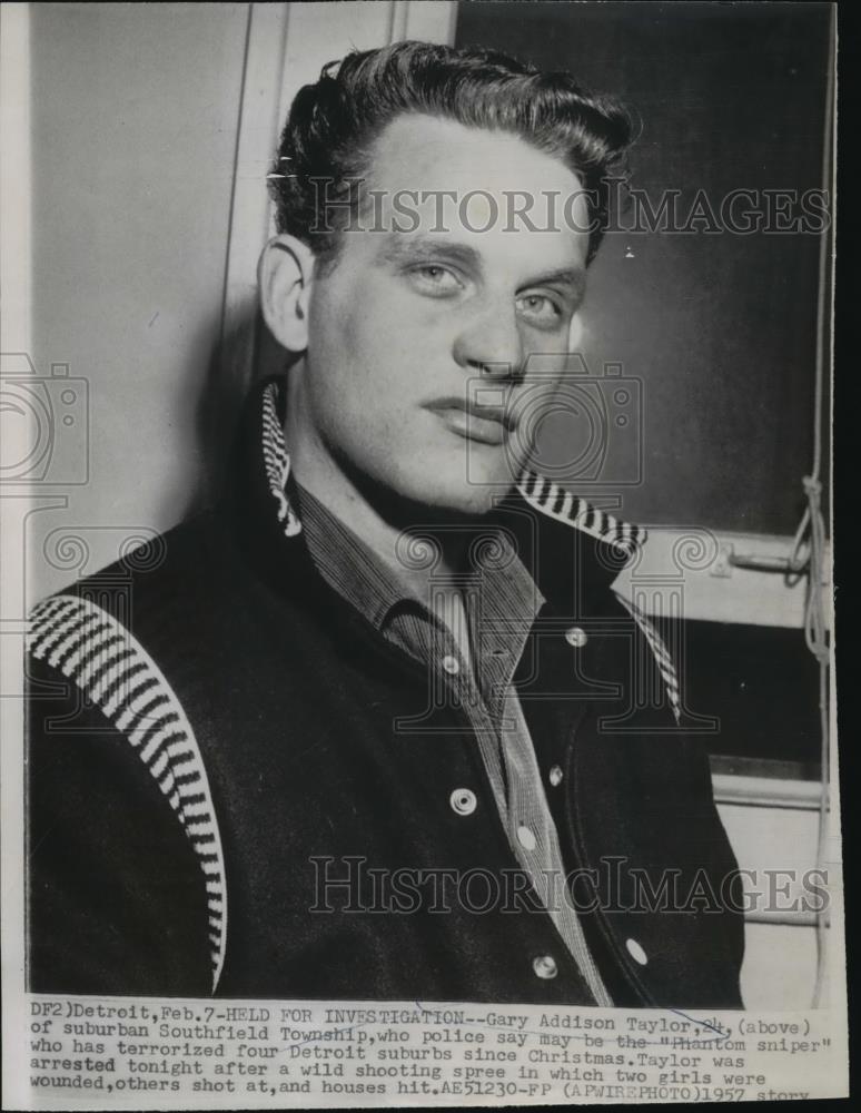 1957 Press Photo Gary Addison Taylor, Arrested for Shooting Spree, Detroit ; Type. Photograph ; Image Color. Black & White ; Listed By. Dealer or Reseller ...