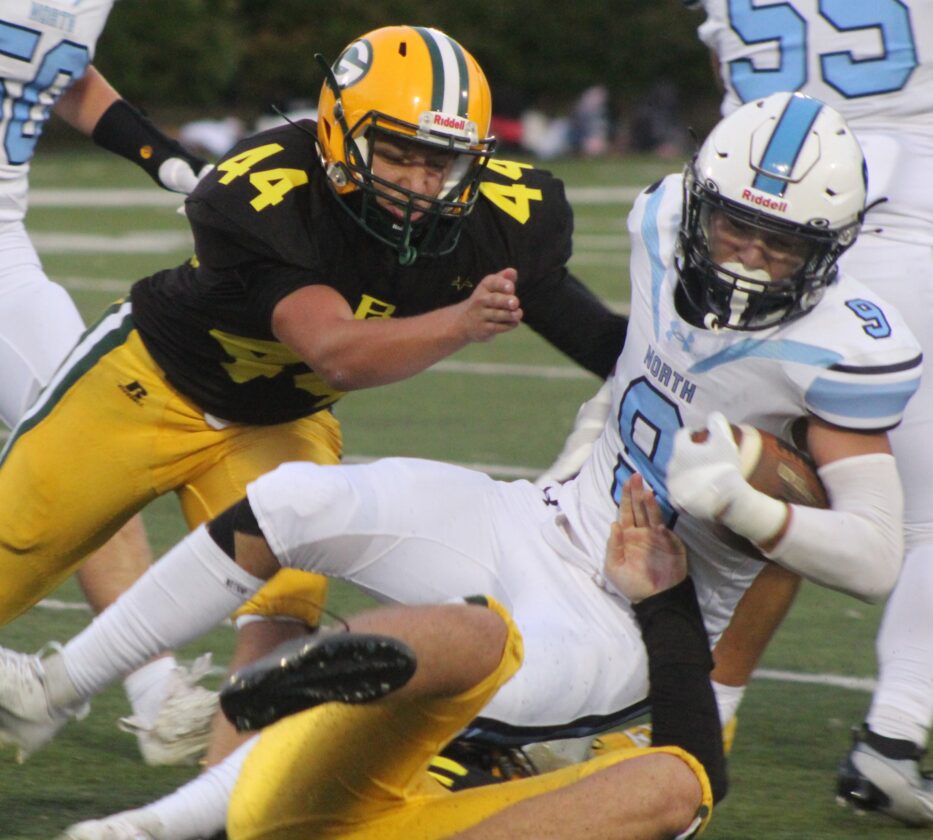 Portsmouth's Colby Gedney is stopped by Nashua North's Jedwin Lluveres (20), Melvin Fernandez (61) and Gavin Adkinson (9) during Friday's ...
